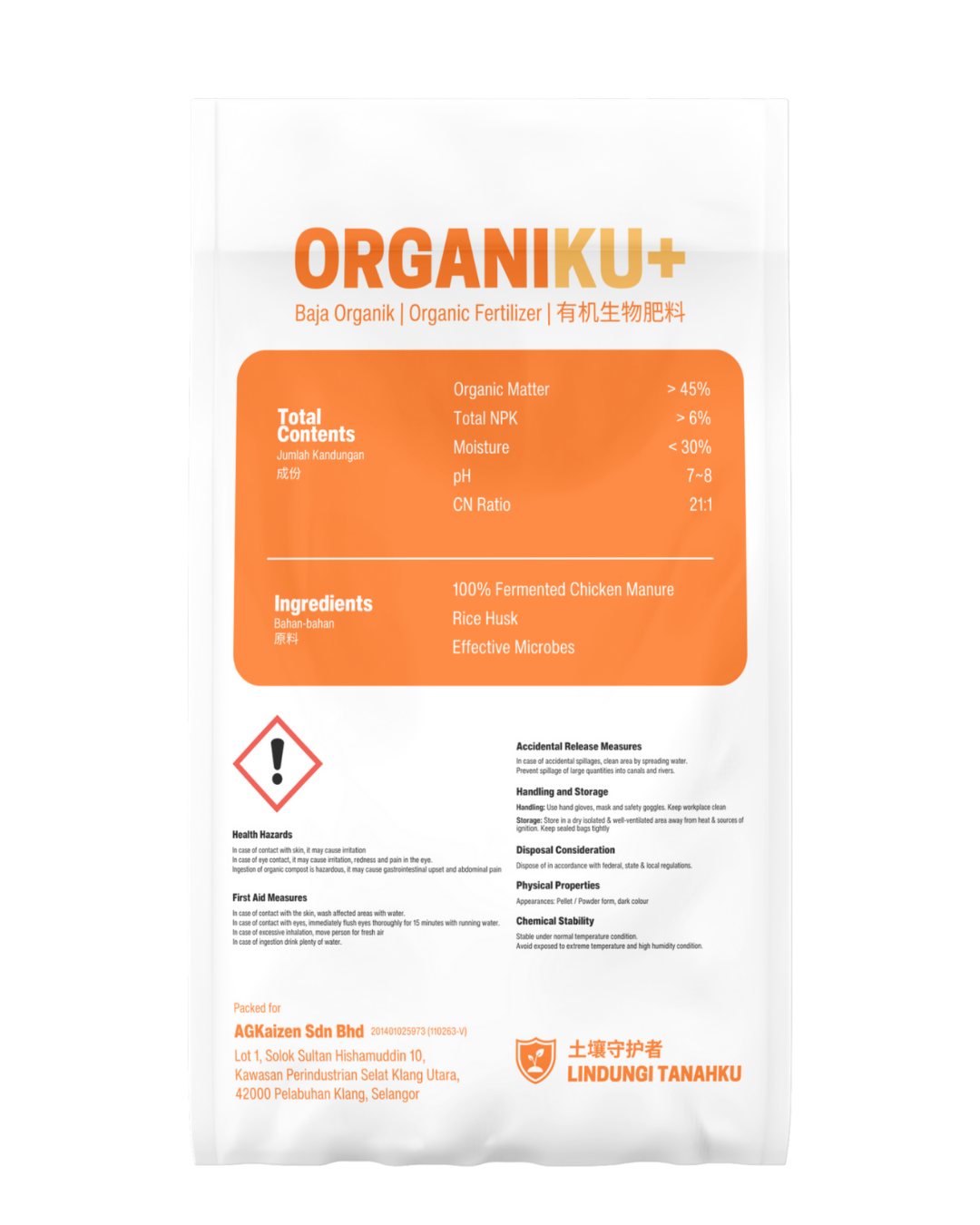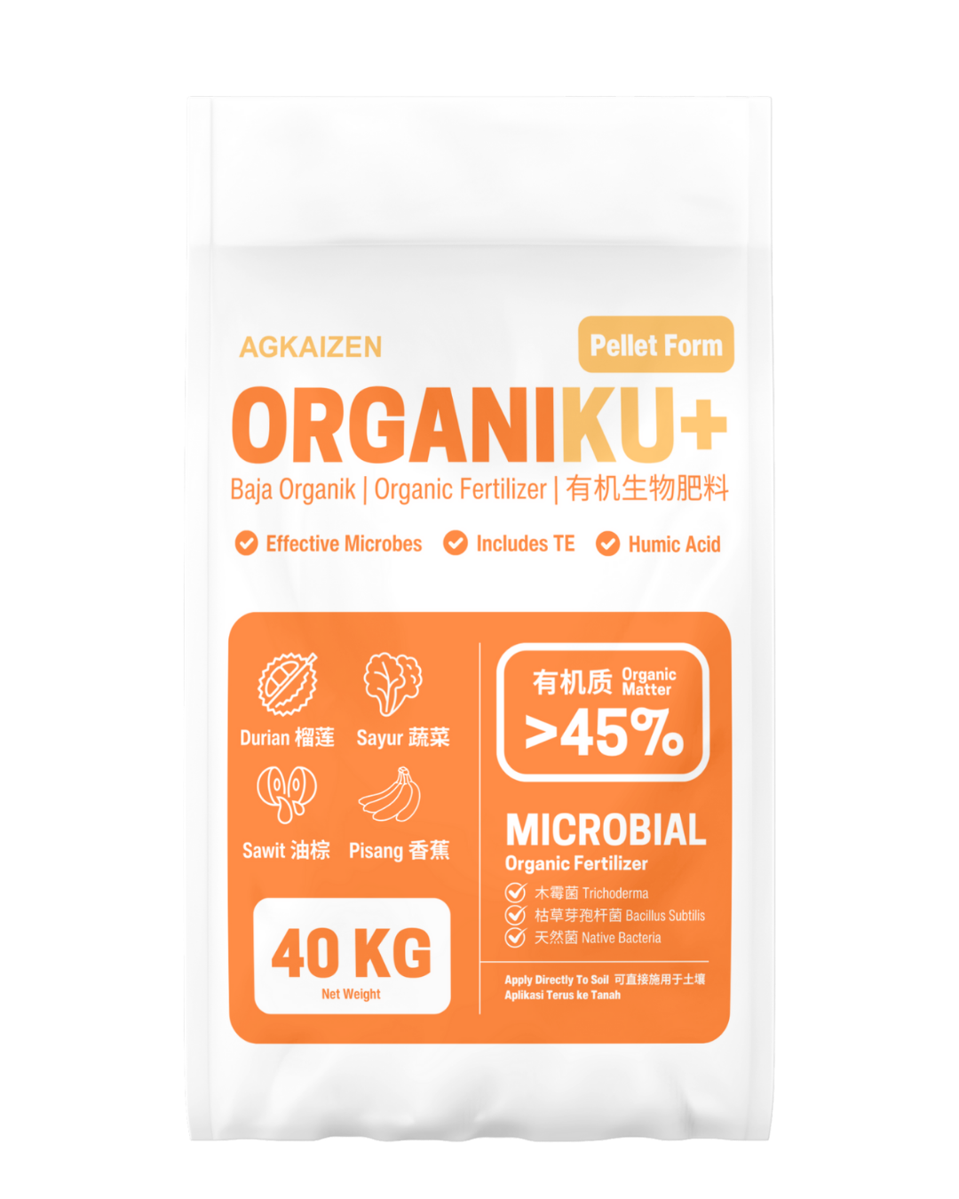ORGANIKU by AGKaizen is a high-performance organic fertilizer developed specifically for Malaysian agriculture. Formulated with over 45% organic matter and a potent mix of effective microbes, it enhances soil health and crop productivity naturally — making it a top choice for growers of durian, banana (pisang), vegetables, and oil palm (sawit).